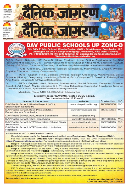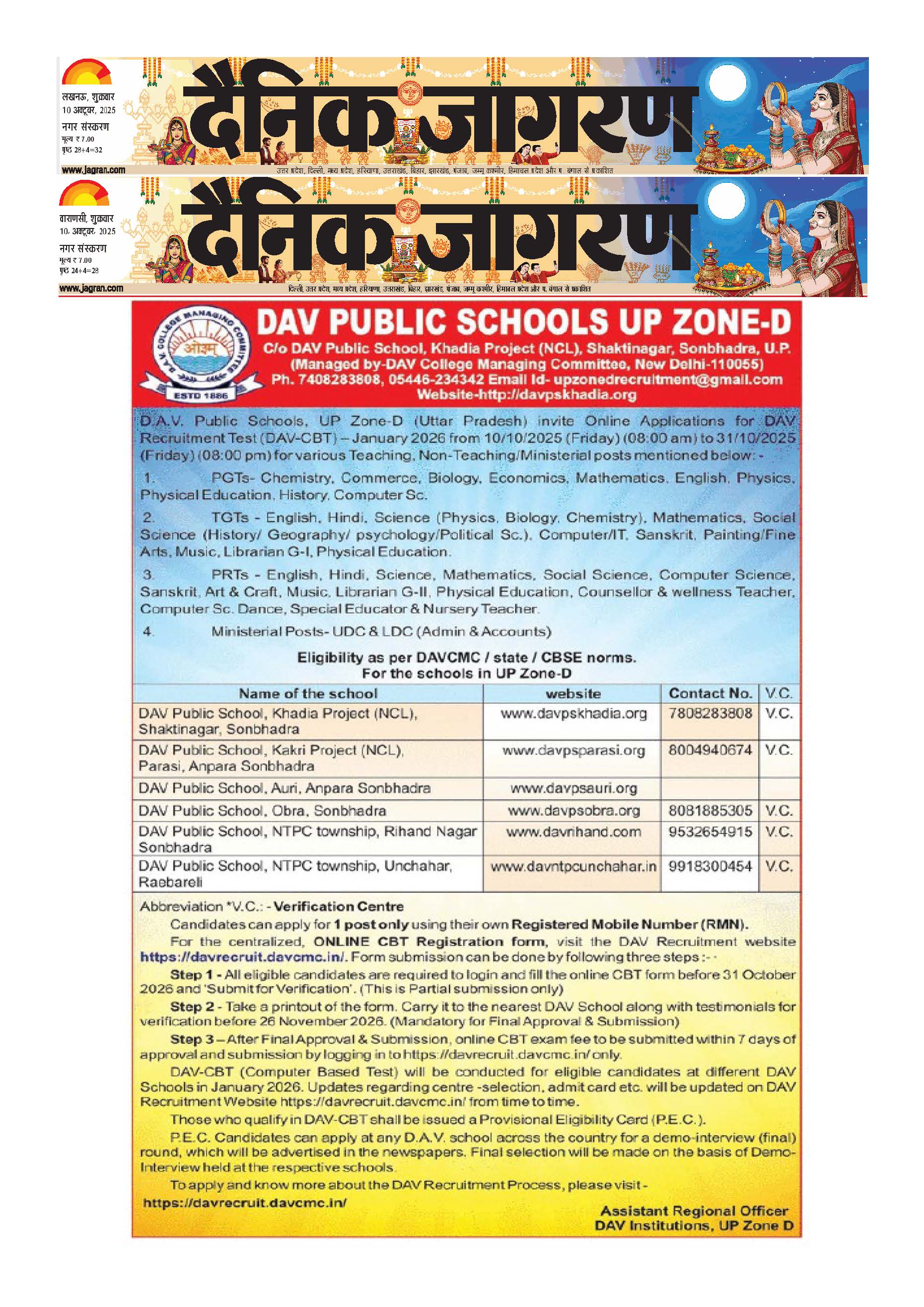 DAV Public Schools, UP Zone-D Advertisement of Vacancies : 2026-27 Link -
